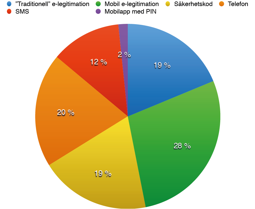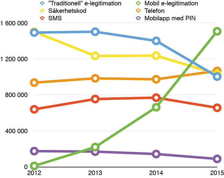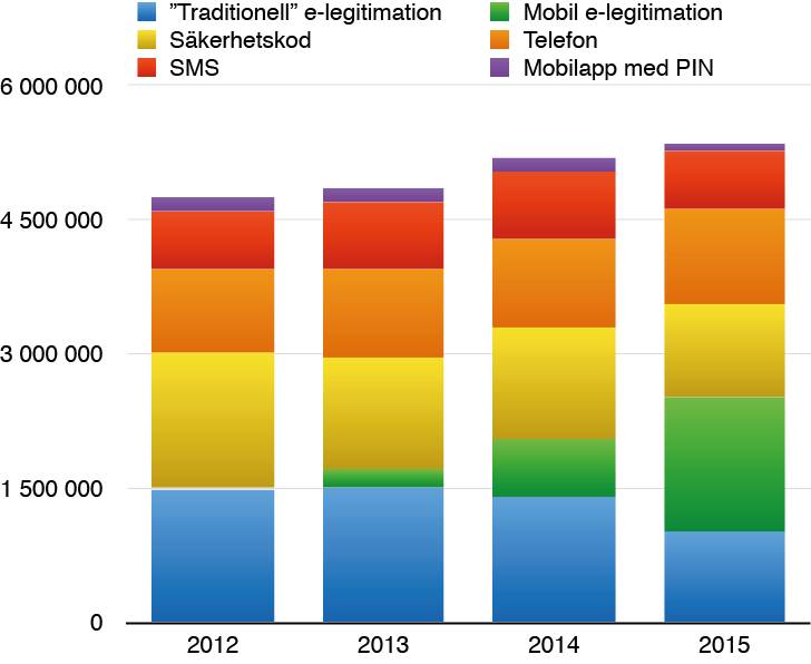 | År | ”Traditionell” e-legitimation | Mobil e-legitimation | Säkerhetskod | Telefon | SMS | Mobilapp med PIN | Summa |