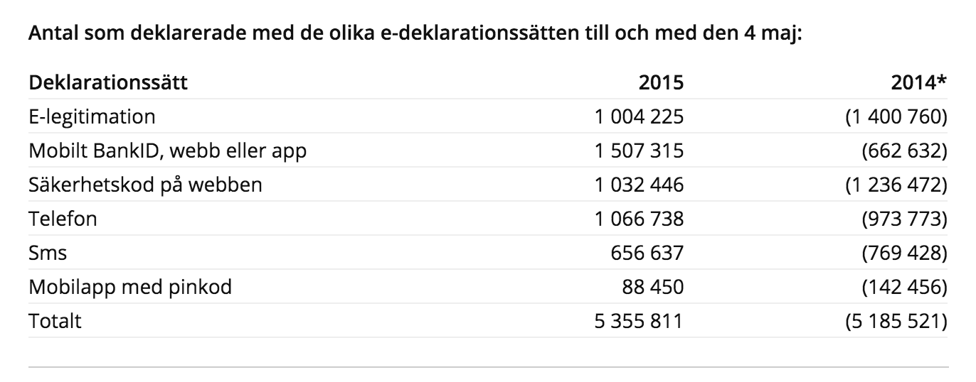 Det ska bli otroligt spännande att göra samma jämförelse igen efter 2016 års deklaration. Kommer antalet e-deklaranter med mobil e-legitimation att överstiga 2,5 miljoner? Kommer antalet med “traditionell” e-legitimation att sjunka under en halv miljon? Vi får helt enkelt vänta och se, men helt klart är i alla fall åt vilket håll det blåser.